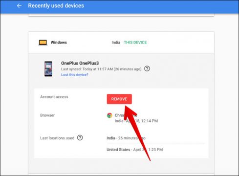 ستجد كافة التفاصيل الخاصة بالهاتف الذكي الذي قمت بإختياره مثل أخر ميعاد تمت فيه عملية المزامنة، والموقع الذي كان متواجد فيه وبالساعة وبالتاريخ، قم بالضغط على خيار REMOVE لإيقاف المزامنة وحذف الحساب من هذا الهاتف.