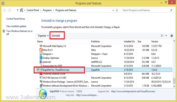 - بعد دخول الي Add or remove programs ابحث عن Superfish.