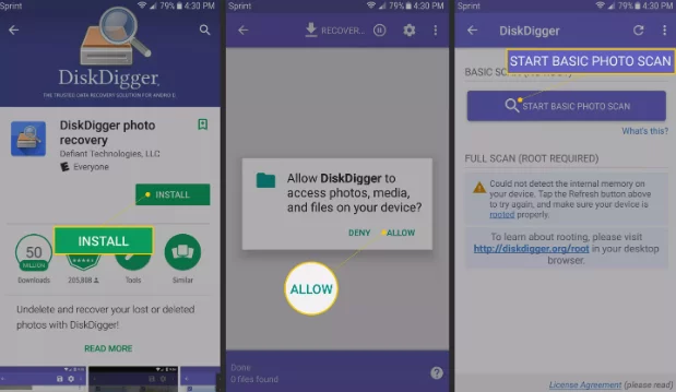 DiskDigger هو احد البرامج المشهورة على جوجل بلاي التي تساعدك على استعادة كل الصور التي تم حذفها سواء من فتره بعيده او من فتره قريبة على هاتفك الاندرويد .