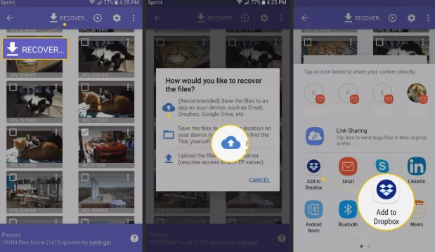 • من اجل استعادة  الصور قم بالضغط على save the files to an app on your device و اختر فولدر على هاتفك الاندرويد تحفظ عليه الصور و يمكنك تخزين الصور التي قم باستعداتها على Dropbox  اذا كنت تمتلك حسابا عليه .