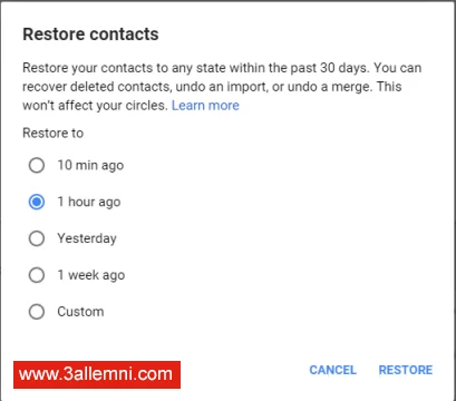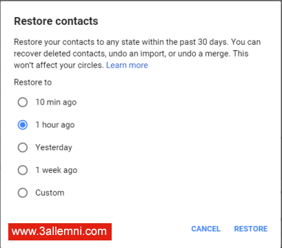 - ثم قم بالضغط علي Restore من القائمة واختر التاريخ الذي قمت بحذف جهات الاتصال فيه وستجد ان جميع جهات الاتصال التي حذفت في هذا التاريخ قد عادت.