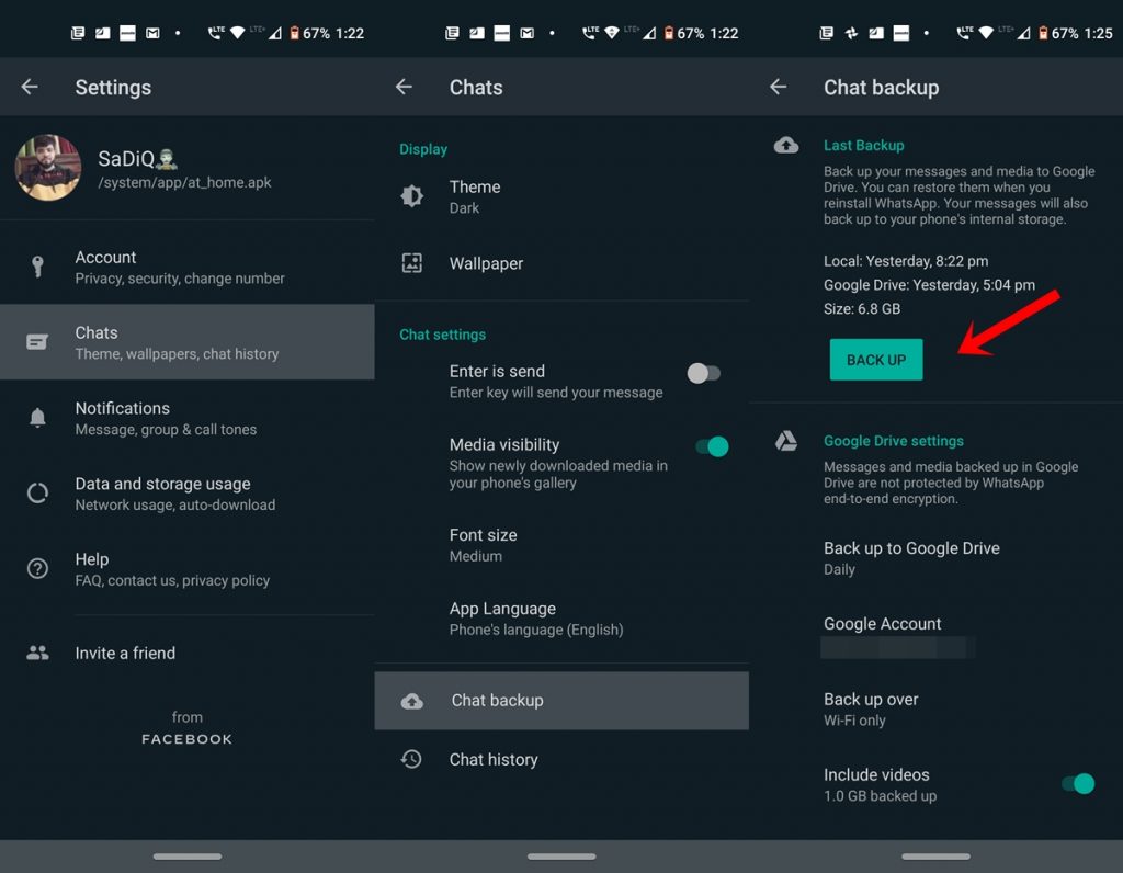 - بعد ذلك قم بالضغط على الدردشات ثم النسخ الاحتياطي للدردشة ثم النسخ الاحتياطي.