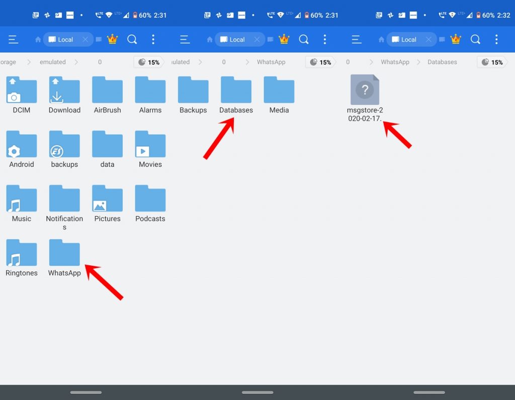 - بعد ذلك يتوجب عليك نقل ملف النسخ الاحتياطي الذي قمت بالحصول عليه من الهاتف القديم إلى مجلد قاعدة البيانات في الهاتف الجديد.