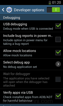 اما اذا كان الهاتف اصداره اقل من 4.2.2 فسوف تذهب الى الاعدادات ثم تختار “المطورين” و منها تقوم بتفعيل “USB Debugging” .