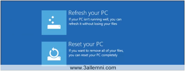 Refresh تقوم باعادة تنصيب الويندوز هيكلياً بدون فقد للملفات اي سيحفظ ويندوز الملفات الشخصية , الخيارات الخاصة بالمستخدم , والتطبيقات المنصبة من متجر التطبيقات