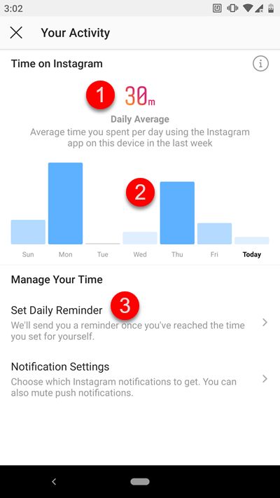 - سوف تلاحظ في الأعلى وجود متوسط يومي لوقتك المقضي على انستجرام.