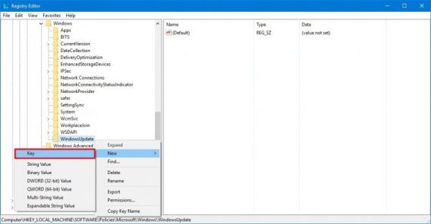 الخطوة الرابعة : قم بالضغط بزر الأيمن للفأرة علي Windows Folder و من إنتقل الي خيار New و من ثم إختر Key .