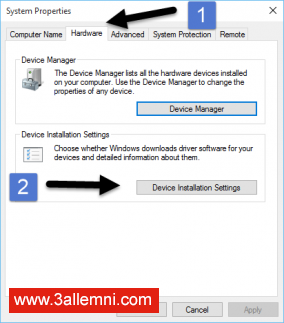 - بعد ذلك الضغط على “Advanced System Settings” لكى تفتح لك قائمه “System Properties” و بعد ذلك اختار منها “Hardware” ثم “Device Installation Settings” المتواجده فى اسفل النافذه