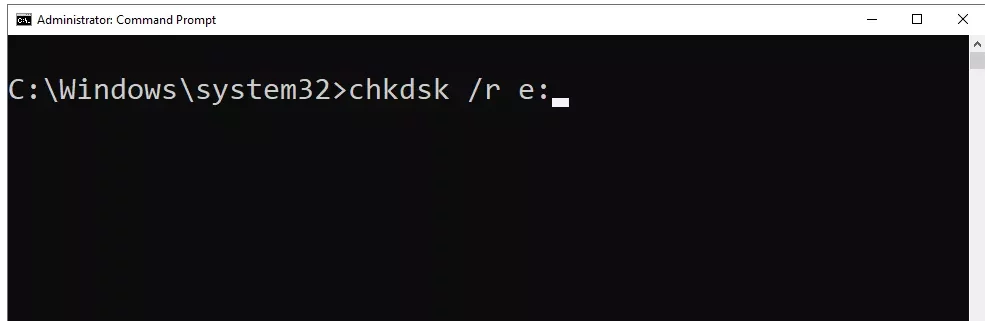 - قم بادخال الامر الاتي chkdsk /r e: و يمكنك استبدال حرف e او الحرف الاخير بحرف محرك الأقراص خاصتك و قم بالضغط على enter .