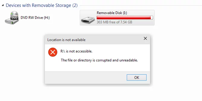 قد يحدث في كثير من الاحيان عند توصيل الهارد الخارجي او بطاقة SD في نظام ويندوز 7 او 8 او 8.1 او 10 حينها يظهر لك الويندوز خطأ The File or Directory is Corrupted and Unreadable