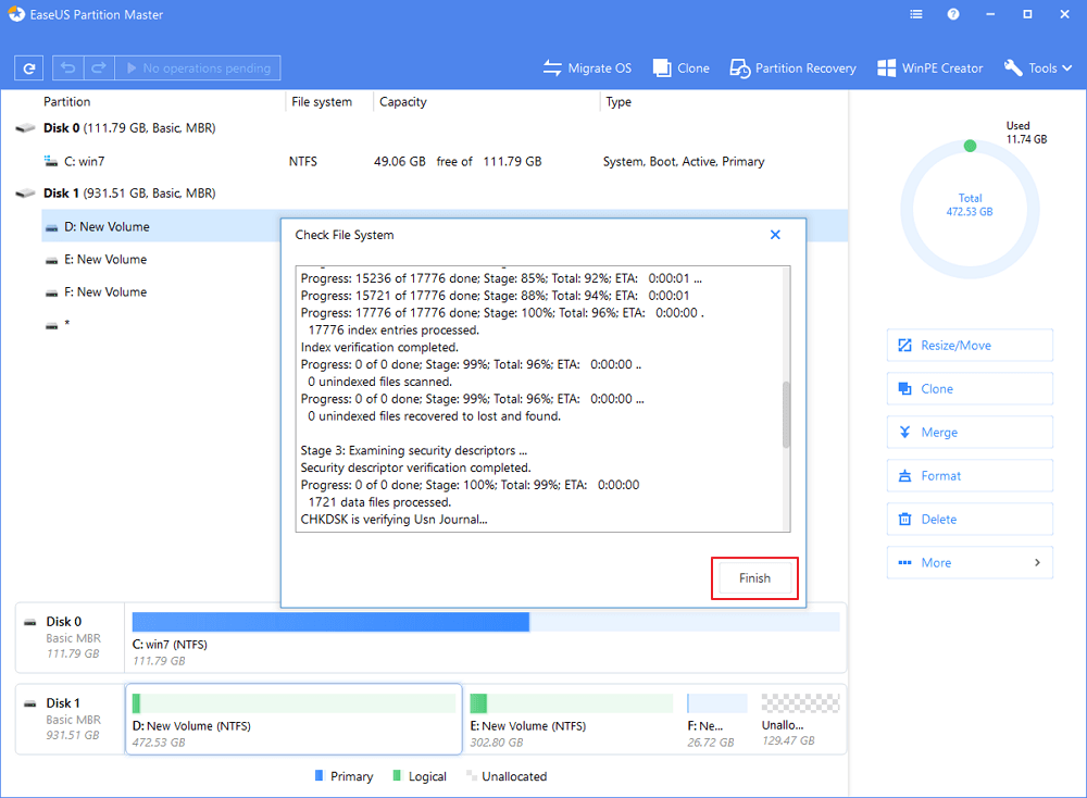 - بعد الانتهاء من فحض ملفات النظام قم بالضغط على Finish .