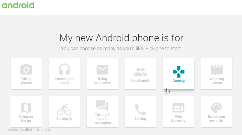 حيث انه عندما تقوم بالضغط على “Get Started” سوف يبدأ بطرح بعض الاسئله عليك اولها هو الغرض الذى تريد شراء الهاتف من اجله و هناك اغراض عديده منها الالعاب او الاستماع الى الموسيقى او مشاهده مقاطع الفيديو و غيره من الاغراض لذا عليك ان تقوم باختيار الغرض الذى تشترى الهاتف من اجله .