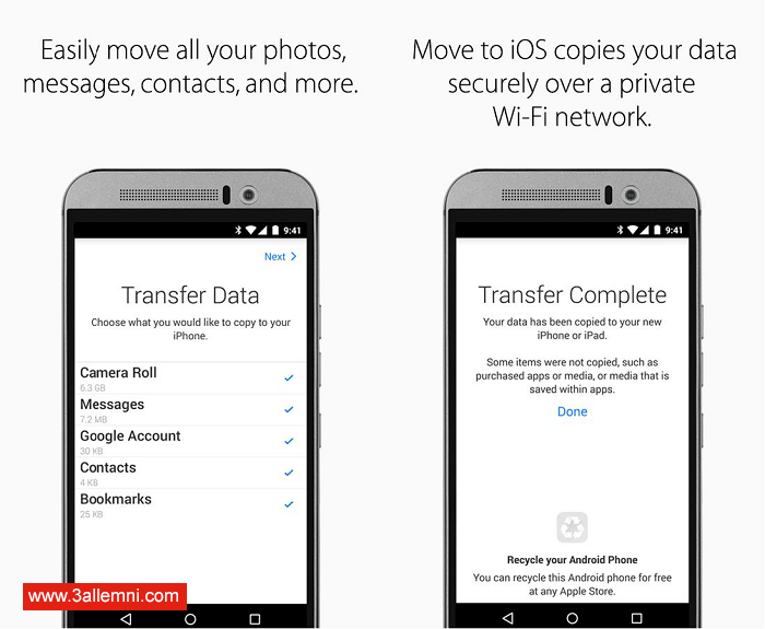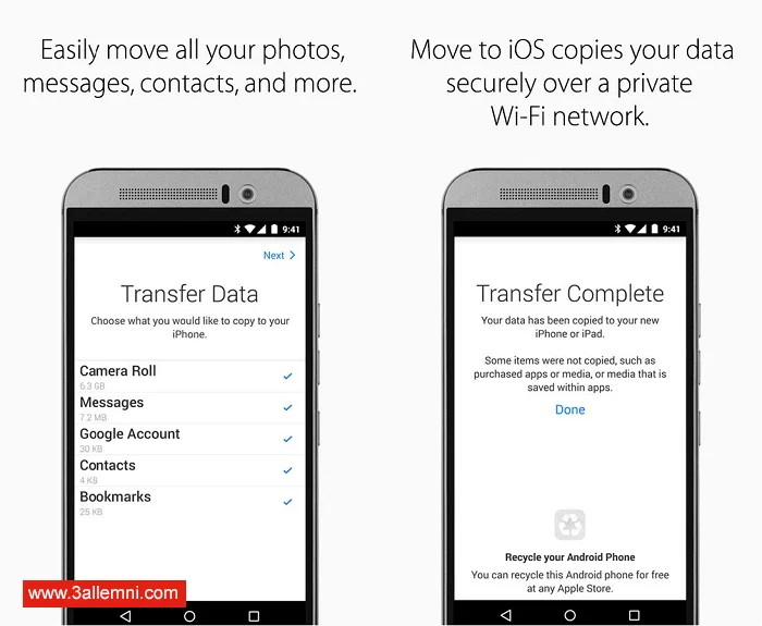 التطبيق الرسمي من Apple يحمل اسم ” Move to iOS ” وهو تطبيق يساعد المُستخدمين علي نقل بياناتهم من جهاز الاندرويد الي جهاز الايفون.