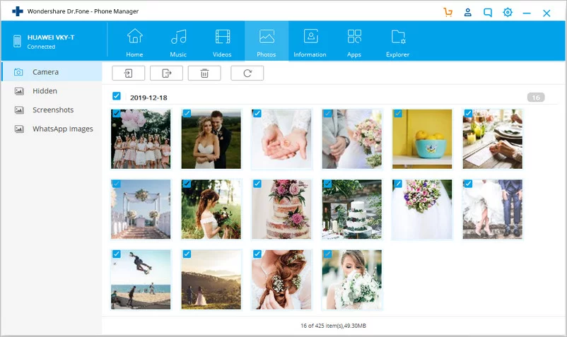 - سيتم عرض كافة الصور الموجودة على هاتفك فقم باختيار ما تريد نقله من الهاتف للكمبيوتر من خلال اختيار أي صورة تريد نقلها إلى جهاز الكمبيوتر الخاص بك والنقر على تصدير “Export” انقر فوق تصدير إلى الكمبيوتر “Export to PC” .