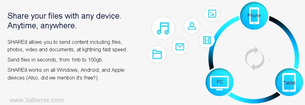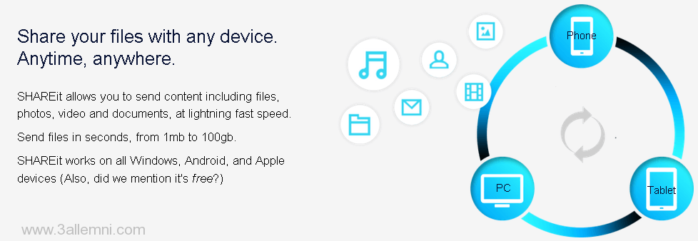 هذا البرنامج هو برنامج ShareIT و هو يعد من البرامج التى لها القدره على نقل الملفات بين الطرفين بسرعه عاليه جدا و هو تطبيق مجانى يسمح لك بنقل ملفات تصل الى 100 جيجا كحد اقصى و لكى تستطيع نقل الملفات يجب عليك ان تقوم بالتالى :-