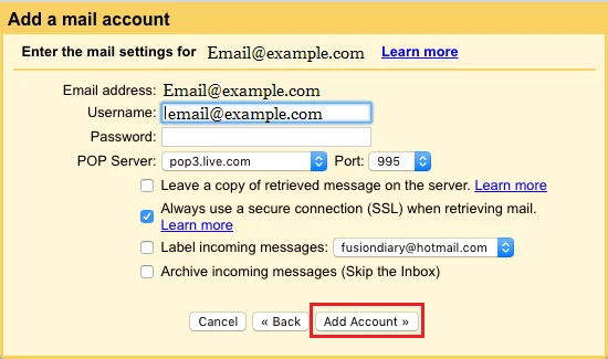 - قم بكتابة كلمة المرور الخاصة بالبريد الإلكتروني القديم و أضغط علي Add Account .