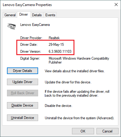 - بعد ذلك قم باختيار قسم الجهاز Device ثم قم بفحص تاريخ التعريف Driver Date وإصدار التعريف Driver Version.