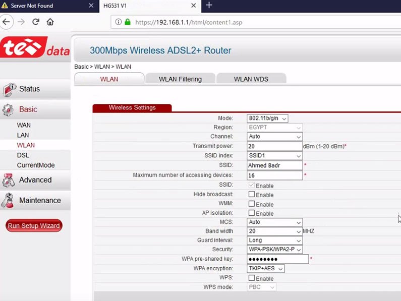 ما يهمنا من هذه الصفحة ، هو ضبط اسم الشبكة و كلمة المرور.