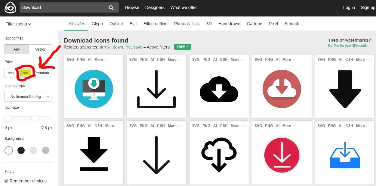 عند فتح الموقع ستجد الاف من الايقونات قم باختيار Free كما هو موضح بالصوره بالاعلى وابدأ بتحميل الايقونات مجاناً!