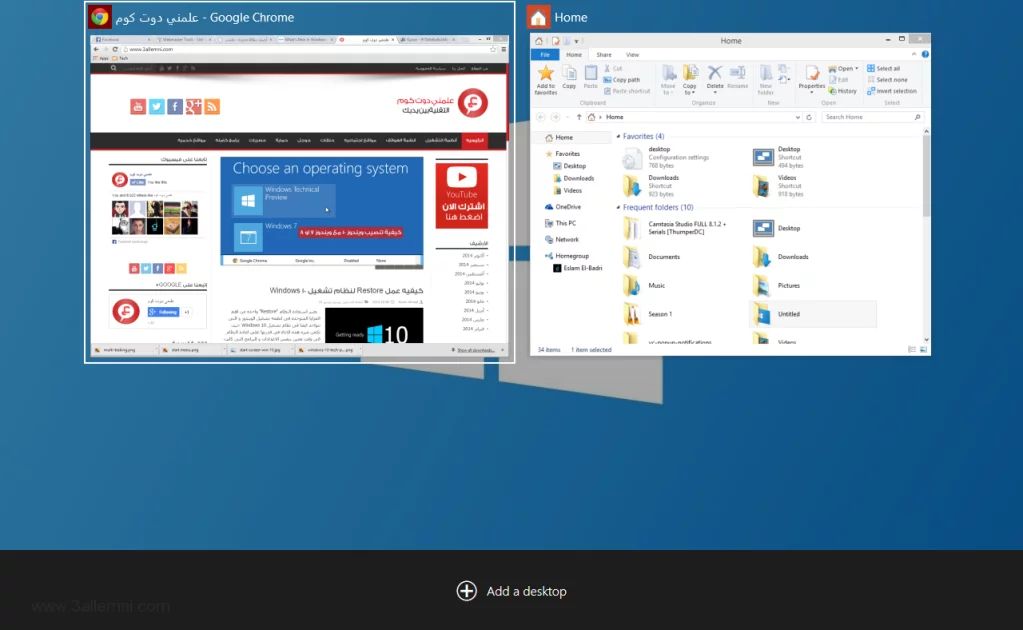 يأتي ويندوز 10 بتصميم جديد للتنقل بين البرامج المفتوحه عوضا عن تقوم بالتنقل الي تطبيق واحد تلو الاخير فعند الضغط علي زر Windows + TAB ستجد جميع البرامج المفتوحه امامك ويمكنك اختيار ذلك كما في ويندوز 8 و 7 او عن طريق الماوس