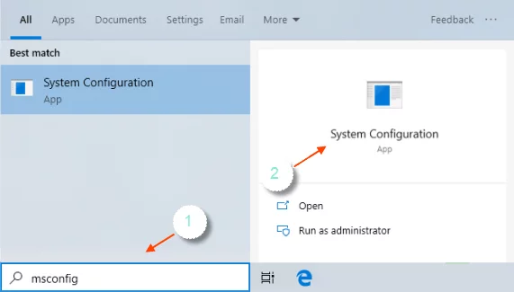 • من خلال شريط البحث في الويندوز قم بكتابة msconfig حتى يمكنك فتح اداة اعداد النظام “System Configuration tool” كما هو موضح في الصورة ادناه  .